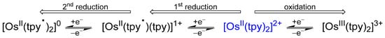 - Sun, M.J.; Shao, J.Y.; Yao, C.J.; Zhong, Y.W.; Yao, J. Osmium Bisterpyridine Complexes with Redox-Active Amine Substituents: A Comparison Study with Ruthenium Analogues. Inorg. Chem. 2015, 54, 8136–8147. [Google Scholar] [CrossRef]