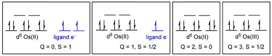 Illustration of the electron configuration for metal-d orbitals (with eg on top and t2g on the bottom, shown in black) and unpaired ligand electrons (depicted in blue) of distorted octahedral bis(terpyridine)osmium(II) (Q = 2), along with its oxidized (Q = 3) and reduced (Q = 1 and Q = 0) forms.