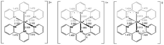Selected bond lengths of [Os(tpy)2]m, m = 0–3, are given in Table 6 and depicted in Scheme 6 for m = 0–2. While the bond lengths of both terpyridine ligands in the m = 2 geometry are equivalent, they differ for the m = 1 optimized geometry. In the m = 1 geometry, one tpy is a (tpy•)1– π-radical anion and the other tpy is a neutral tpy0 ligand. The (tpy•)1– π-radical is non-symmetrically coordinated to the Os(II) ion having one short Cpyridine-Cpyridine distance of 1.429 Å, characteristic of a (tpy•)1– π-radical [50], and a second longer Cpyridine-Cpyridine of 1.467 Å, which is more common of a neutral ligand. The Cpyridine-Cpyridine bond length of the neutral tpy ligands in [Os(tpy)2]2+ is 1.470 Å. Analysis of the Mulliken spin density of the m = 1 geometry indicates that the unpaired electron on the (tpy•)1– π-radical is mainly located on the two pyridines that are connected by the shorter Cpyridine-Cpyridine bond. The m = 0 geometry contains two identical (tpy•)1– π-radicals (Scheme 6). Both (tpy•)1– π-radicals are non-symmetrically coordinated to Os(II), with the spin density in each radical mainly located on the two pyridines that are connected by the shorter Cpyridine-Cpyridine bond, see spin plot in Figure 7.