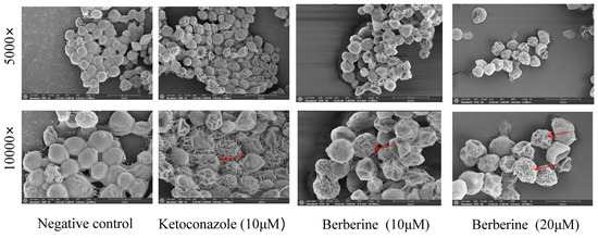 SEM−based surface morphological evaluation of C. neoformans cells to assess the effect of 24 h ketoconazole and berberine post−treatment. The presence of holes in the cell surface is indicated by the red arrows. The cells were examined at magnifications of 5000× and 10,000× under SEM. The scale bar for images is 1.0 μm.