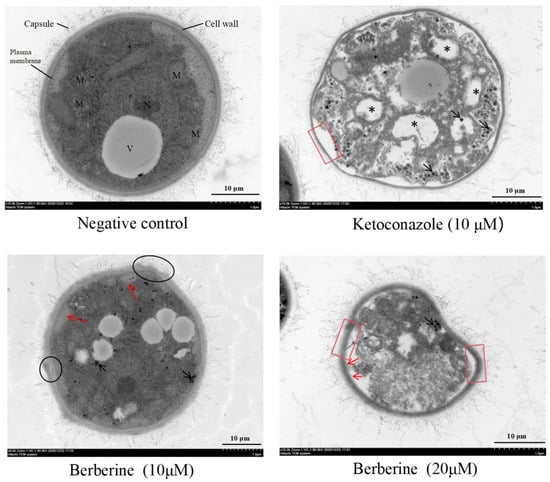 TEM visualization of the cross-sections of the untreated and ketoconazole- and berberine-treated C. neoformans cells after 24 h. Cells were observed under TEM at 10,000× magnification. TEM showed the changes in cell ultrastructure after incubation with berberine or ketoconazole, including the following: cytoplasmic vacuoles containing vesicles (black asterisks), intracellular and extracellular vesicles (red arrows), cells showing organelle leakage from vacuoles (black arrows), cell wall breakage (black circles), invaginations of the plasma membrane extending into the cytoplasm, and shrunken cytoplasmic membranes detached from the cell wall (shown in red frames). Three independent experiments, with six biological replicates/group, were performed for each drug treatment. Micrographs in this image represent one of six biological replicates analyzed. M: mitochondrial; V: vacuoles; N: nucleus.