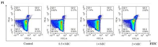 In this experiment, the Annexin V FITC/PI double staining method of flow cytometry was used to preliminarily determine the mode of action of the drug on fungi. Stationary-phase C. neoformans cells were refreshed and adjusted to 1 × 106 CFU/mL in YM medium and subsequently cultured for 4 h with berberine at concentrations of 0.5 × MIC, 1 × MIC, and 2 × MIC. Afterward, the cells were prepared and analyzed using flow cytometry with a flow cytometry analyzer (Agilent, Palo Alto, CA, USA), following established protocols [14].