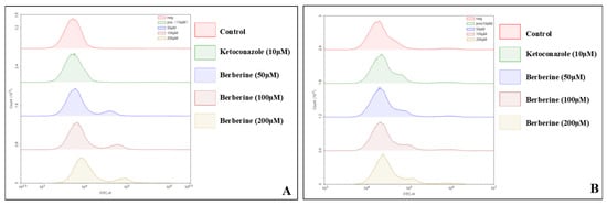 Rhodamine 123 was prepared into a 1 mM masterbatch for spare parts, and the activated organisms were diluted to 1 × 106 CFU/mL; different concentrations for the dosing group and control group were set up, and a final concentration of 1–2 μM Rhodamine 123 was added to each group, and the incubation was protected from light for 30 min; different concentrations of berberine were added, and a normal control with no dosing and 10 μM ketoconazole was set up as the positive control, incubated for 6 h away from light; after collection, the organisms were washed with PBS 2~3 times, and fluorescence trends were observed with a flow cytometer in FITC channel.