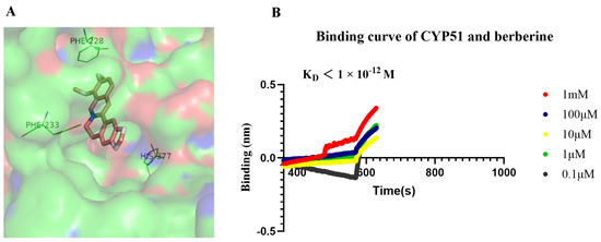 Docking studies revealed that berberine binds in close proximity to the active site pocket of C. albicans CYP51 (CYP51Ca, binding affinity: −10.6 kcal/mol). The residues surrounding berberine are predominantly hydrophobic, notably Phe228. Berberine’s two methoxy groups and benzene ring form hydrophobic interactions with the Phe228 residue of CYP51. In our model, the distal phenyl ring of berberine, featuring methoxy groups, forms aromatic interactions with His377, while a hydrogen bond is established between the nitrogen atom of berberine and the hydroxyl group of Phe233. To further investigate, we assessed the binding affinity of berberine to CYP51Ca using biolayer interferometry (BLI). As shown in Figure 6, berberine binds to CYP51Ca in a dose-dependent manner, with a dissociation constant (KD) of less than 1 × 10−12 M. These findings indicate that berberine exhibits a strong binding affinity to CYP51Ca, which likely contributes to its antifungal properties.