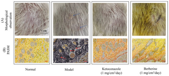 Histological analysis revealed normal dermal structure in the negative control group. In contrast, the untreated model group exhibited widespread fungal mycelium, highlighted by PASM staining. However, in the ketoconazole- and berberine-treated groups, fungal hyphae and spores were rarely observed, indicating the efficacy of both treatments.