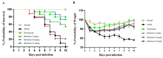 Six-week-old female ICR mice were immunosuppressed via intraperitoneal (i.p.) injection of CY (200 mg/kg body weight; Meilun, Dalian, China) for the first 3 days. On Day 4, mice were inoculated i.p. with 200 µL of C. neoformans at a concentration of 1 × 108 cells/mL in normal saline and then randomly assigned to five groups: model group, 5 mg/kg FLC group, 5 mg/kg berberine group, 10 mg/kg berberine group, and 15 mg/kg berberine group, with 10 mice per group. An additional group of 10 uninfected mice served as the normal control. One hour post-infection, each group received the assigned treatment or water via oral gavage, which was continued daily for 7 days. Body weight and survival rates were monitored over a 10-day period.