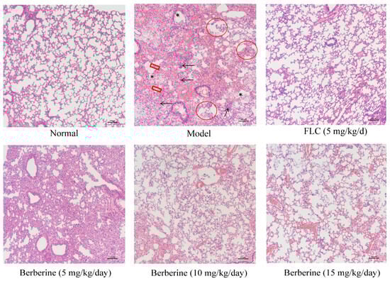 Lung Histopathology. Lung tissue sections were stained with H&E and analyzed from the following groups: normal mice, mice infected with C. neoformans alone, and mice treated with 5 mg/kg/day of FLC, 5 mg/kg/day of berberine, 10 mg/kg/day of berberine, and 15 mg/kg/day of berberine. Features observed included widening of the alveolar intervals and thickening of the alveolar septa (red frame), collapsed pulmonary alveoli (red circle), infiltration of inflammatory cells (black arrows), alveolar edema (black star), and structural disorganization. Scale bar = 100 μm.