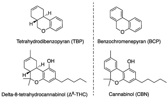 As can be seen in Figure 1, these core motif structures are naturally found in certain phytocannabinoids, such as Δ8-THC (delta-8-tetrahyd rocannabinol) and cannabinol (CBN), which are both secondary metabolites found in marijuana (Cannabis sativa and C. indica) and hemp (C. sativa) [27]. C. indica is often characterized as a relaxing and pain-relieving species with a more balanced cannabinoid profile, whereas C. sativa is often characterized as an energizing and uplifting species with a higher THC content [28].