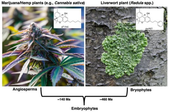 Convergent evolution between angiosperms (e.g., Cannabis sativa) and bryophytes (e.g., Radula perrottetii) is observed among natural secondary metabolites possessing the TBP scaffold: Δ9-THC from marijuana/hemp and cis-PET from liverwort. Plant images generated with the assistance of artificial intelligence (AI) via OpenAI’s DALL·E image modeling program—https://openai.com/dall-e-2 (accessed on 6 October 2024).