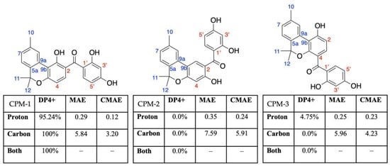 DP4+ probability analyses, mean absolute error (MAE), and corrected mean average error (CMAE) for CPM-1 and two of its regioisomers. Coloration of structure numbering represents the starting material: blue- (S)-cis-verbenol; red- 2,2′,4,4′-tetrahydroxybenzophenone. The entire data set and calculations for the TPMs and CPMs can be found in the Supplementary Materials section.