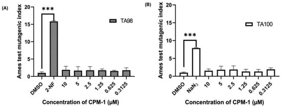 Ames mutagenicity test of CPM-1 via Salmonella TA98 and TA100 strains. (A) Index for frameshift mutations using 2-nitrofluorene (2-NF) as the positive control. (B) Index for base-pair substitutions using sodium azide (NaN3) as the positive control. *** significant at p < 0.001 compared to the negative control (DMSO).