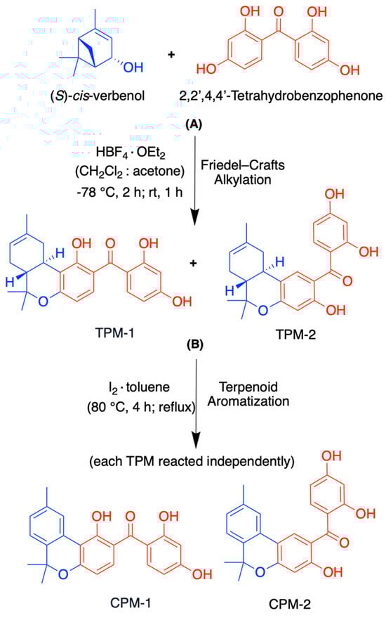 ACS and HPLC grade chemicals, reagents, and solvents were purchased through VWR (Leicestershire, UK), ThermoFisher Scientific (Waltham, MA, USA), and Sigma Aldrich (St. Louis, MO, USA). Starting reagents for producing TPMs were (S)-cis-verbenol (95%) and 2,2′,4,4′-tetrahydroxybenzophenone (97%), along with tetrafluoroboric acid-diethyl ether (HBF4·OEt2), used as a reaction catalyst. (S)-cis-verbenol is naturally found in the feverfew flowering plant (Tanacetum parthenium) and a few other organisms, whereas many types of resorcinols, such as TBP, are synthetics produced from plant resins [31,32]. (S)-cis-verbenol has the “S” configuration and has the specific rotation = −9° in chloroform. A vanillin stain solution (15 g/250 mL EtOH + 2.5 mL H2SO4), in conjunction with a heat gun, was utilized to observe and monitor the reaction and final products. Iodine (I2, >99%) was utilized as a reagent for the aromatization reaction. A Fast Blue B Salt solution (0.1 g/250 mL DI H2O) was utilized to stain CPM compounds possessing aromatic rings. Reactions were monitored for completion via TLC.