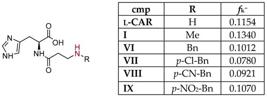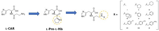 Finally, the synthesis of the other compounds (II, III, and VI–IX) was performed in one step through a reductive amination reaction of l-carnosine and the corresponding carbonyl compound in the presence of the appropriate reducing agent (Scheme 3). All new compounds were characterized by 1H NMR, 13C NMR, and MS analyses (see Section 3 and Supplementary Material).