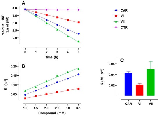 Kinetics data obtained for carnosine (CAR), compound VI, and compound VII. (A) Semilog plot of residual HNE (0.05 mM initial concentration) when incubated alone or with a 40-fold molar excess of compounds; (B) pseudo-first-order rate constants as a function of the concentration of compounds and (C) bar graph reporting the reaction rate constants.