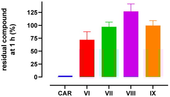 Residual concentrations of carnosine (CAR) and compounds VI–IX. Data were collected after incubation for 1 h in human serum at an initial concentration of 5 µM.