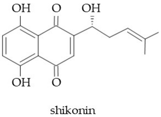 Naphthoquinones are a subclass of chemical compounds classified among quinonoids (quinones). The spatial arrangement of their chemical structure is characterized by the addition of another benzene ring connected to para-benzoquinones [8]. The presence of quinones (pigments) is a characteristic attribute of several Boraginaceae taxa. Of these dyes, shikonin (red pigment; Figure 8) was the first to be isolated from the roots of the Chinese plant Lithospermum erythrorhizon in the second decade of the 20th century [175]. To date, shikonin and its derivatives have been extracted from Borago spp., Alcanna spp., Arnebia guttata Bunge, Arnebia euchroma, Maharanga spp., Lithospermum erythrorhizon, Onosma paniculatum, Onosma hookeri, E. vulgare, E. russicum, and E. italicum [4,6,7,8,96,176]. Recently, shikonin-type naphthoquinones have been reported in Rindera graeca, an endemic Greek plant [25].
