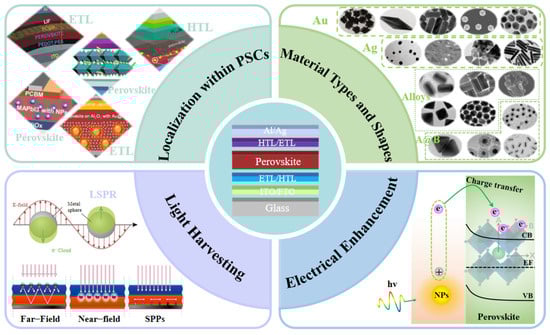 This review provides a comprehensive summary of recent advancements in the enhancement of PSCs through the incorporation of plasmonic nanostructures. Initially, the analysis delves into four prominent manifestations of LSPR employed in photovoltaic devices: far-field scattering, near-field enhancement, HET, and PRET. Subsequently, the applications of MNPs—comprising precious metals such as Au and Ag and common metals like Al and Cu, as well as various alloys—are systematically reviewed and analyzed based on their types and shapes. The results demonstrate that incorporating MNPs with different LSPR properties into PSCs can effectively improve the efficiency and overall performance of these cells. However, despite the significant advancements made thus far, several issues and challenges remain to be addressed for the widespread commercialization of plasmonic-enhanced PSCs: