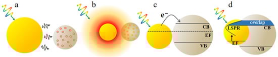The four enhancement mechanisms of plasmonic nanostructures. (a) Far–field scattering. (b) Near–field coupling. (c) Hot–electron transfer. (d) Plasmon resonant energy transfer. Reproduced with permission from Ref. [72]. Copyright 2016, the Royal Society of Chemistry.