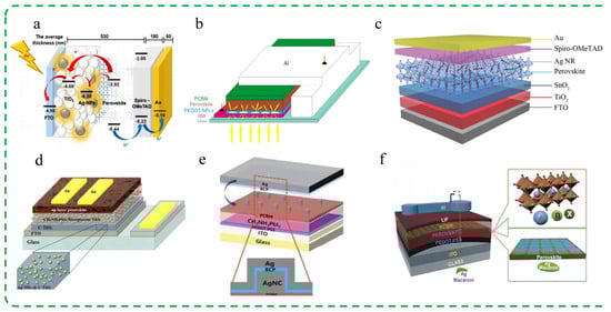Ag nanoparticles. Precious MNPs can effectively enhance the light trapping efficiency of photovoltaic devices through the excitation of LSPR under illumination. Nourolahi et al. embedded plasmonic Ag nanoparticles into the TiO2 layer of mesoporous heterojunction PSCs to study their impact on the device’s photovoltaic characteristics [97]. The final results showed that compared to samples without added Ag nanoparticles, the PCE of the fabricated cells increased by over 30%. According to the analysis of UV–visible absorbance data, the improved performance can be attributed to the far-field scattering and near-field coupling radiation effects of the Ag nanoparticles doped in the visible wavelength range of the solar spectrum, effectively extending the optical path of the incident light and increasing the photon absorption of the active perovskite layer. At the same time, the electron transfer time between the TiO2 interface layer and the photovoltaic perovskite layer is reduced due to the improved frequency response of the electron transfer behavior in the photoelectric anode interface layer. The schematic diagram of the structure of the PSCs with added Ag nanoparticles is shown in Figure 3d.