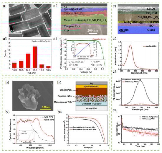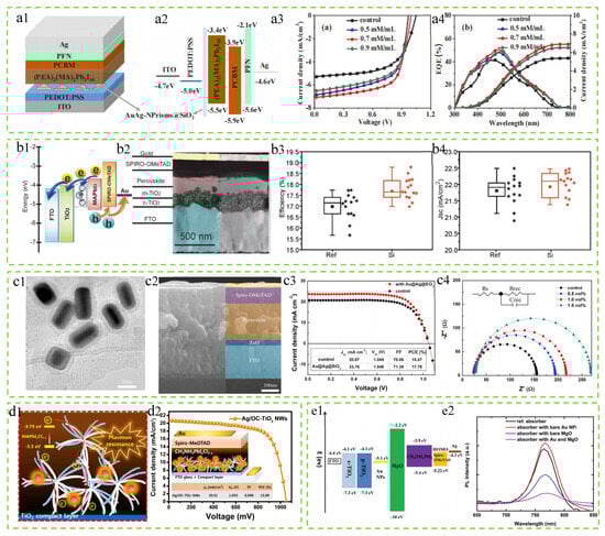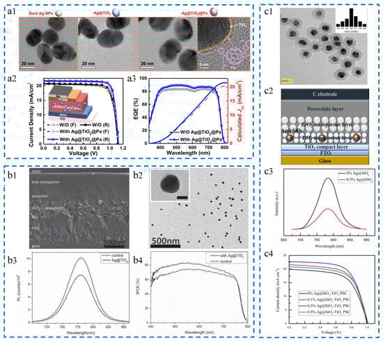 Ag@TiO2 nanoparticles. Michael et al. successfully incorporated core–shell Ag@TiO2 nanoparticles into PSCs through a low-temperature processing approach, leading to an increase in device efficiency to 16.3% [101]. This enhancement is mainly attributed to the increase in JSC. As shown in Figure 4(b1,b2), the scanning electron microscope (SEM) cross-section of the solar cell and the transmission electron microscope (TEM) image of Ag@TiO2 nanoparticles, where the Ag@TiO2 nanoparticles are composed of a 40 nm Ag core and a 2 nm TiO2 shell, can be observed. Figure 4(b3,b4) separately represents the steady-state photoluminescence spectrum and the photovoltaic conversion efficiency of the reference device and the device with added Ag@TiO2 nanoparticles. It can be seen from the figure that the addition of nanoparticles does improve the performance of the photovoltaic device, especially in the visible light range of 400–750 nm.