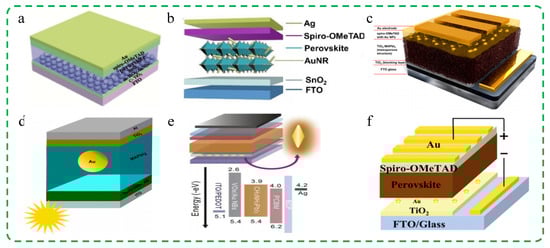 Au nano-octahedrons (NOs). Fang et al. synthesized Au NOs with broadband LSPR peaks and appropriate sizes and added them to the ETL (TiO2) of PSCs [108]. Figure 5f shows the schematic structure of the cell device. The results showed that the JSC of the cell reached 23.63 mA/cm2, and the PCE increased from 16.95% to 19.05%. This is because the LSPR of the nanostructure enhanced the light capture of the cell, improving the device’s light harvesting capability and carrier extraction. Au NOs can enhance the light absorption of perovskite layers by increasing the light-scattering cross-section, and perovskite layers can effectively excite more excitons. In addition, Au NOs also lower the surface potential of ETL, facilitating the extraction and transfer of electrons and holes photo-generated at the ETL/perovskite layer interface. Therefore, both JSC and VOC of PSCs have been significantly improved, leading to a corresponding enhancement in PSCs’ efficiency.