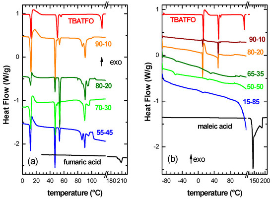 Figure 1 reports the DSC measurements of the pure components and of the two series of mixtures between TBATFO and fumaric acid (panel a) or maleic acid (panel b). Pure TBATFO undergoes a melting process around 115 °C. A visual inspection indicated that this sample was certainly solid at around 80 °C. Therefore, the three additional endothermic processes that were present around 13, 50, and 56 °C should be ascribed to solid–solid phase transitions [19]. Fumaric (maleic) acid exhibited a structured endothermic peak between 190 and 215 °C (130 and 190 °C), which was due to the superposition of melting and the subsequent decomposition (as obtained from the TGA measurements in Figure S2).
