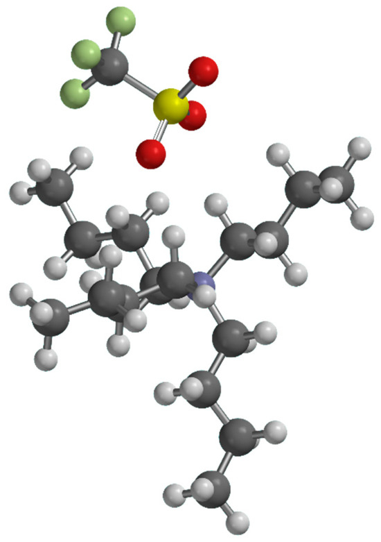 The TBATFO ion pair structure. White spheres are oxygen atoms, grey ones are carbon atoms, the yellow one is sulfur and the green ones are fluorine.