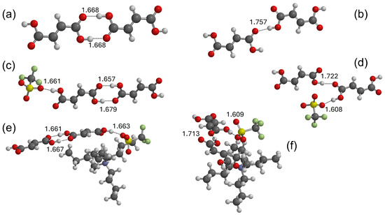 Some models have been proposed herein to evaluate the intermolecular interactions between different components in the mixtures. The interactions between TFO and acid have been described as a series of complexes wherein TFO is coupled with a single FUM (Figure S4a) or MAL (Figure S5a) molecule, with a dimer of FUM (Figure 3c,d) or MAL (Figure 4d) and with a trimer of FUM (Figure S4b or Figure S5b). The progressive increase in the number of acid molecules in such complexes allows us to investigate how the interaction of the negative head of the anion TFO with carboxylic acid is affected by the clustering of the acid component. The role of the cation in the aggregation process is then considered by adding a TBA cation to each TFO: the geometry of some TBA-TFO-acid complexes has been optimized and their structures are depicted in Figure 3e,f (TBA-TFO-FUM) and Figure 4e (TBA-TFO-MAL).
