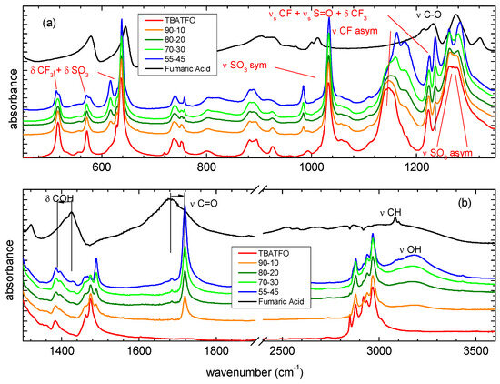 Infrared spectra of TBATFO, fumaric acid, and their mixtures in various compositions in the frequency ranges of 420–1300 cm−1 (panel (a)) and 1300–3600 cm−1 (panel (b)).