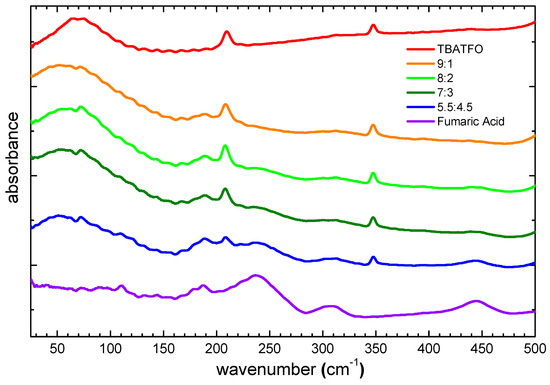 Far-infrared spectra at room temperature of TBATFO, fumaric acid, and their mixtures in various compositions.