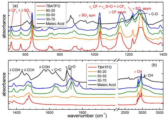 Infrared spectra of TBATFO, maleic acid, and their mixtures at various compositions in the frequency ranges of 500–1400 cm−1 (panel (a)) and 1350–3600 cm−1 (panel (b)).