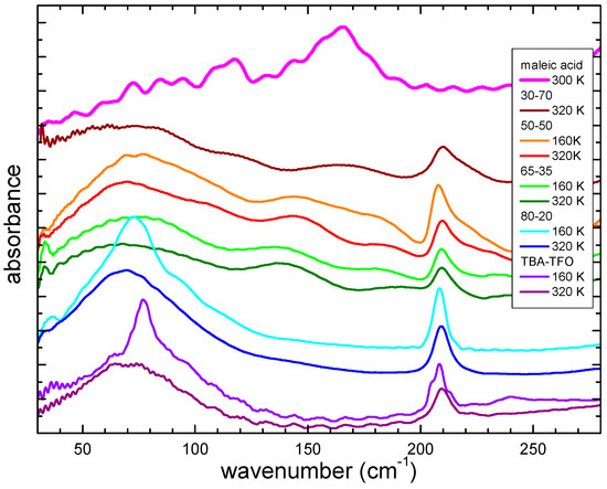 The far-infrared spectra of selected mixtures containing maleic acid are depicted in Figure 10 at 160 and 320 K, together with the spectra of the pure components. Maleic acid presents an absorption peak around 170 cm−1, while TBATFO has its peak centered around 70 cm−1, due to the dispersion forces. At low temperatures, it becomes more structured, and a very evident structure around 80 cm−1 develops. In the mixtures, contrary to what has been observed in the mixtures with fumaric acid (Figure 7), one can see a broad band similar to that of TBATFO, without any evident frequency shift. This fact suggests a reduced variation of the dispersion forces in the mixtures with maleic acid. Interestingly, in the mixtures close to the eutectic one (30-70, 50-50, and 65-35), it is possible to observe the appearance of broad and poorly intense bands around 120 and 170 cm−1, which, due to their wavenumber, could be ascribed to the stretching mode of hydrogen bonds. This can be explained by the fact that the maleic acid in the mixtures develops HBs with TFO.