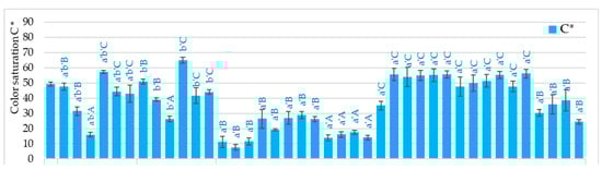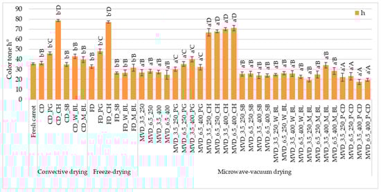 The effect of the type of osmotic enriching agent (NFC juice) and convective drying as pre-treatment, drying method, and microwave-vacuum-drying parameters on values of C* and h color parameters of dried carrots. Different letters a’, b’ (type of drying method); A, B, C, D (type of pre-treatment)—homogeneous groups show the statistical difference at p ≤ 0.05. When all the data were in one homogenous group (p > 0.05), a’, A letters were omitted. Code designations of dried samples are as in the caption of Table 1.