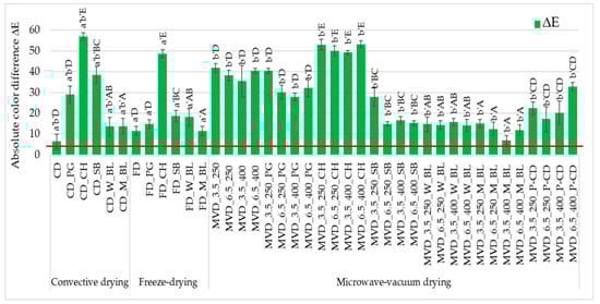 The effect of the type of osmotic pre-treatment (NFC juice) or thermal pre-treatment, drying method, and microwave-vacuum-drying parameters on the absolute color difference (ΔE) of dried carrot samples. Different letters a’, b’ (type of drying method); A, B, C, D, E (type of pre-treatment)—homogeneous groups show the statistical difference at p ≤ 0.05. When all the data were in one homogenous group (p > 0.05), a’, A letters were omitted. Code designations of dried samples are as in the caption of Table 1. The red line marks the limit of ΔE values above which color differences are visible to the average observer.