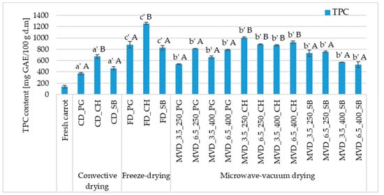 Regarding TPC content in dried carrots, both pre-treatments and their absence before each type of drying were beneficial because drying caused the concentration of these compounds in the dried carrots. Compared to the raw material, the TPC content in the dried carrots increased by 3–9 times. Drying by the FD and MVD methods gave a similar effect of increasing the TPC content, including a greater effect after enrichment in CH juice. Various factors could influence the increase in the TPC content in the dried carrots.