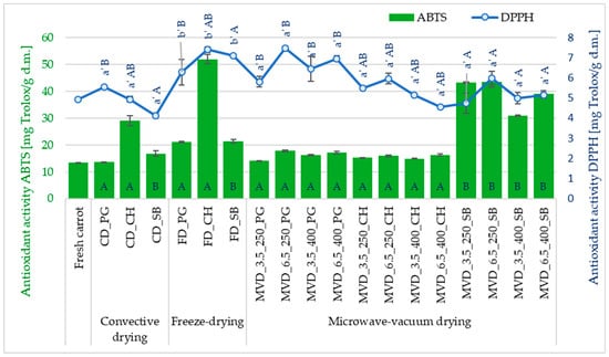 Osmotic enrichment of carrots with PG juice components (6.4 mg Trolox/g d.m.) contributed to obtaining significantly higher average antioxidant activity of DPPH• dried carrots compared to carrots enriched with SB juice (5.3 mg Trolox/g d.m.). The antioxidant activity DPPH• of dried carrots enriched with CH juice did not differ significantly and averaged 5.6 mg Trolox/g d.m. Despite the rather diversified antioxidant activity ABTS•+ of dried carrots, statistical analysis did not show a significant effect of the drying method on the value of this indicator. The average antioxidant activity of ABTS•+ in the tested dried products in the setting from the lowest to the highest value, depending on the type of drying method, was as follows: freeze-drying (FD; 30.0 mg Trolox/g d.m.) ⇒ microwave-vacuum method (MVD; 23.7 mg Trolox/g d.m.) ⇒ convection (CD; 18.6 mg Trolox/g d.m.). The values of the average antioxidant activity of ABTS•+ dried carrot products enriched with PG and CH juice did not differ significantly; they were 15.9 and 16.2 mg Trolox/g d.m., respectively. A separate homogeneous group (B) was formed by dried products obtained from enrichment with SB juice with an average value of 39.6 mg Trolox/g d.m.