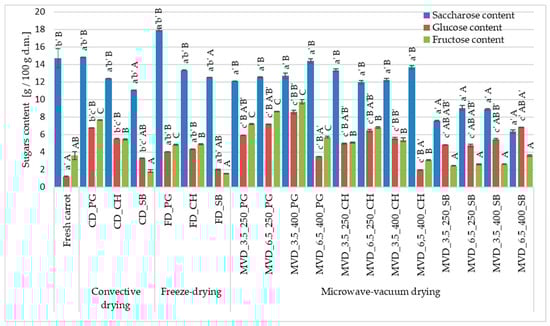 The total sugar content in the raw material was about 19.53 g/100 g d.m., including a saccharose content of about 75.3% and a fructose content of 18.4% (Figure 5). The influence of the MVD drying method and conditions and osmotic pre-treatment was demonstrated and also caused significant changes in the total sugar content, including the content of measured sugars, i.e., saccharose, glucose, and fructose (Figure 5). Compared to the raw material, the changes in the sugar content profile in osmotically enriched carrot consisted of a decrease in the saccharose content and an increase in the glucose and fructose content. Regardless of the drying method, in the case of osmotic pre-enrichment in pomegranate juice, the sugar content increased the most, by 49.9 and 37.4% in samples dried by convection and freeze-drying, and in the case of puffing drying by 45.5 and 59.1% in samples dried under a pressure and at a microwave power of 6.5/250 and 3.5 kPa/400 W, respectively. The obtained values depended on the drying parameters. It was observed that higher pressure (6.5 kPa) at a lower microwave power (250 W) caused an increase in the total sugar content, regardless of the type of NFC juice. At a higher microwave power, the relationship was reversed, especially in the case of using PG juice with a high glucose and fructose content (60.6–68.0 g/L), as well as saccharose (approx. 4.5 g/L).