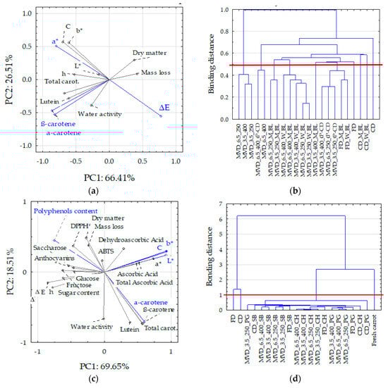 PCA and cluster analysis of technological properties related to thermal pre-treatment (blanching and convective drying) and drying method with MVD drying parameters (a,b) and data related to carrot pre-enrichment (c,d): (a,c) PCA graphs; (b,d) cluster analysis. Markings: L*, a*, b*, C, h, and ΔE—lightness, redness, yellowness, saturation, tone and absolute color difference, respectively. Blue lines (a,c) indicate active data included in the PCA analysis. Red lines separate values smaller than distances 0.5 (b) and 1.0 (d), allowing distinguishing groups of clusters with similar properties for standardized values.