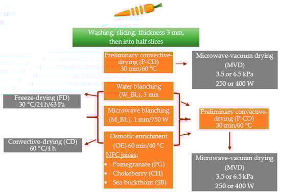 The research material was carrots from the “Tadeusz Karaś” horticultural farm purchased in a large-format store in Warsaw. Until the tests were carried out, the raw materials were stored at a refrigerated temperature of approximately 4 °C and a relative air humidity of 85–90%. Carrots (C) with a diameter of about 2 cm were washed and then, without removing the skin, cut into 3 mm thick slices using a slicer (Robot Coupe CL50, Vincennes, France) and then manually into half-slices. The samples were subjected to preliminary convective drying (P-CD), water blanching (W_BL), microwave blanching (M_BL), and osmotic enrichment in NFC juices from pomegranate (PG), chokeberry (CH), and sea buckthorn (SB) (Table 6 and Table 7). Then, the carrot samples were dried using three drying methods (Figure 7), i.e., microwave-vacuum drying (main method), convection drying, and freeze-drying (comparative methods).