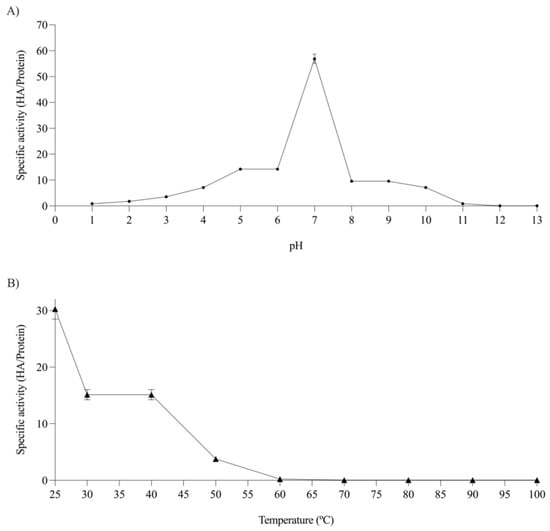 Hemagglutination activity was determined across a pH range of 1 to 13. The highest activity was observed at pH 7. Both acidic and basic conditions resulted in decreased activity, with no activity detected at pH values below 2 or above 11 (Figure 4A). On the other hand, the effect of temperature on hemagglutinating activity was determined, and it was found that the optimal temperature was 25 °C. The gradual increase in temperature led to a decrease in activity until a complete loss of activity was observed at 60 °C (Figure 4B).