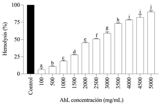 Aliquots of 20 µL of type A erythrocyte suspension (4% in PBS) were mixed with AhL solution at different concentrations (100, 500, 1000, 1500, 2000, 2500, 3000, 3500, 4000, 4500, and 5000 µg/mL in PBS). The samples were incubated for 30 min at 37 °C, and absorbance was measured at 540 nm using an Epoch 2 spectrophotometer (BioTek, Winooski, VT, USA) [67]. Triton-X 100 (Sigma Chemical Co., Burlington, MA, USA) at 20% was used as a control. The results were expressed as a percentage of hemolysis, with the control considered as 100% hemolysis.