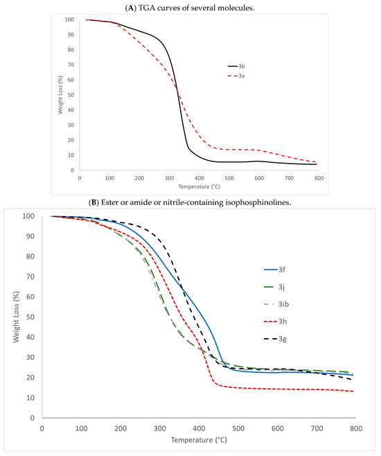 TGA curves of several molecules 3: (A) Phenyl-containing isophosphinolines, (B) ester or amide or nitrile-containing isophosphinolines, and (C) phosphonate-containing isophosphinolines.
