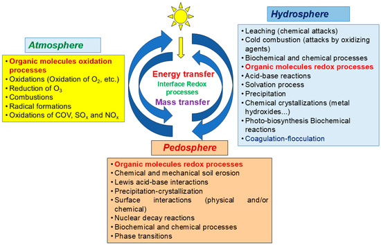 For instance, the atmosphere is often polluted by oxides of carbon (COx such as CO and CO2), sulfur (SOx) and nitrogen (NOx) along with volatile organic compounds (VOCs). These gas pollutants are recognized as being the main causes of the greenhouse effect, SMOG, acid rain, ozone layer depletion and other phenomena at their interfaces with other media. The reciprocal interactions of the different parts of the environment (atmosphere, hydrosphere and pedosphere) are mainly due to their interdependence via mass and energy transfer (Scheme 2).