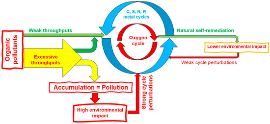 Organic compounds are chemical species that are not necessarily included in the metabolisms of flora and fauna; more specifically, they often originate from synthetic procedures. They can even be alien compounds with respect to the natural cycles of purely inorganic media, and their mere occurrence is a perturbation of the global environmental equilibrium. Even if they are biodegradable, as is the case for most recent forms of agro-industrial waste, their production throughput often surpasses the self-regeneration capacity of the natural host media, leading to the accumulation of waste and pollution (Scheme 3).
