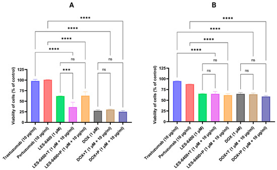 Cell survival of AGS gastric cancer cells (A) and HCC1954 breast cancer cells (B) was assessed after 24 h of treatment with LES-6400 alone, trastuzumab alone, pertuzumab alone, doxorubicin alone (DOX), and the following combinations: LES-6400 + trastuzumab (LES-6400 + T), LES-6400 + pertuzumab (LES-6400 + P), DOX + trastuzumab (DOX + T), and DOX + pertuzumab (DOX + P). Means ± SD, are shown with N = 3. ANOVA tests were used to demonstrate differences between cells treated with compounds alone and the combination of compounds and antibodies. **** p ≤ 0.0001; *** p ≤ 0.001; ns p > 0.05—not statistically significant.