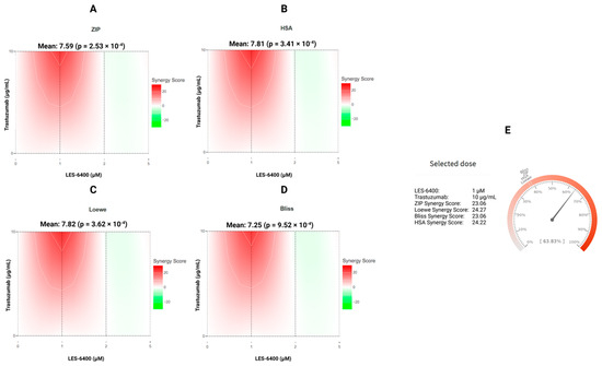 The synergy distribution between the juglone-based Thiopyrano[2,3-d]Thiazole LES-6400 and the anti-HER2 trastuzumab antibody against the AGS gastric cancer cell line is demonstrated for ZIP (A), HSA (B), Loewe (C), and Bliss (D). Additionally, the presented Synergy Barometer for LES-6400 + T (1 μM + 10 μg/mL) is illustrated (E).