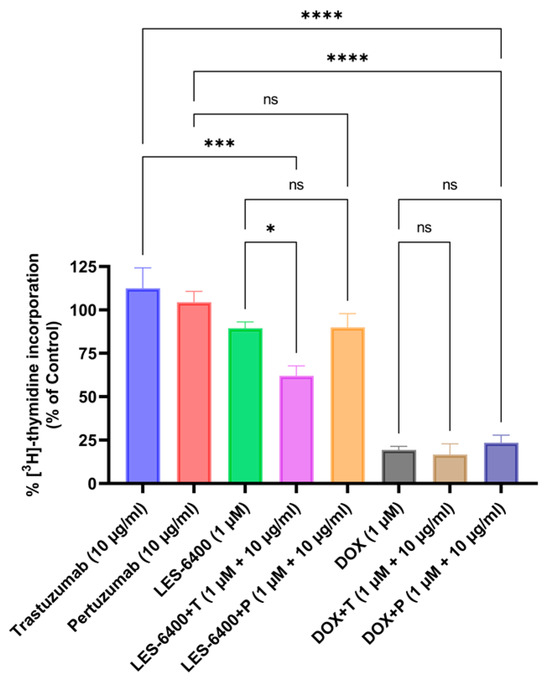 Incorporation of [3H]-thymidine into AGS gastric cancer cells was measured after 24 h of treatment with LES-6400 alone, trastuzumab alone, pertuzumab alone, DOX alone, and combinations of LES-6400 + T, LES-6400 + P, DOX + T, and DOX + P. Means ± SD are shown with N = 3. ANOVA tests were used to demonstrate differences between cells treated with compounds alone and the combination of compounds and antibodies. **** p ≤ 0.0001; *** p ≤ 0.001; * p ≤ 0.05; ns—not statistically significant.