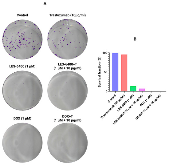 In addition to the MTT assay, the efficacies of treatment with the LES-6400 compound alone, trastuzumab alone, doxorubicin alone and the combinations LES-6400 + T and DOX + T were evaluated using the clonogenic assay. It was found that after 24 h of exposure, the survival fraction of cells treated with the combined therapy of LES-6400 (1 μM) and trastuzumab (10 μg/mL) (7.18%) was approximately 2 times lower than the fraction after exposure to LES-6400 (1 μM) alone (13.87%) and 13 times lower than after treatment with trastuzumab (10 μg/mL) alone (95.48%) (Figure 5). In contrast, the survival fraction of cells treated with doxorubicin, both with and without trastuzumab, was approximately 0%.