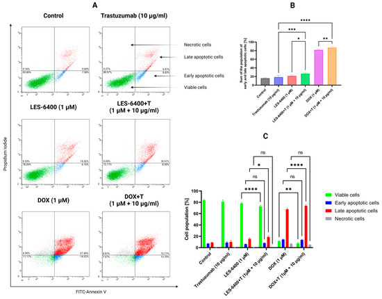 Results of flow cytometry analysis of AGS gastric cancer cells after 24 h of incubation with compound LES-6400 (1 μM), trastuzumab (10 μg/mL), DOX (1 μM), and the combinations LES-6400 + T (1 μM +10 μg/mL), and DOX + T (1 μM + 10 μg/mL) (A). The top graph (B) shows the totals of the apoptotic cell populations for each sample, while the bottom graph (C) visualizes the cytograms from the compound analysis. Means ± SD are shown with N = 3. ANOVA tests were used to demonstrate differences between cells treated with compounds alone and the combination of compounds and antibodies. * p ≤ 0.05; ** p ≤ 0.01; *** p ≤ 0.001; **** p ≤ 0.0001; ns—not statistically significant.