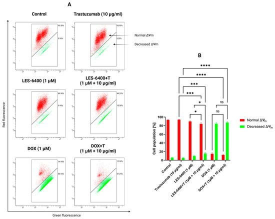 Results of flow cytometry measurement (A) of changes in the mitochondrial membrane potential (ΔΨm) of AGS gastric cancer cells after 24 h of incubation with compound LES-6400 (1 μM), trastuzumab (10 μg/mL), DOX (1 μM), and the combinations LES-6400 + T (1 μM + 10 μg/mL), and DOX + T (1 μM + 10 μg/mL). The graph (B) visualizes the cytograms from the compound analysis. Means ± SD are shown with N = 3. ANOVA tests were used to demonstrate differences between cells treated with compounds alone and the combination of compounds and antibodies. * p ≤ 0.05. *** p ≤ 0.001; **** p ≤ 0.0001; ns—not statistically significant.